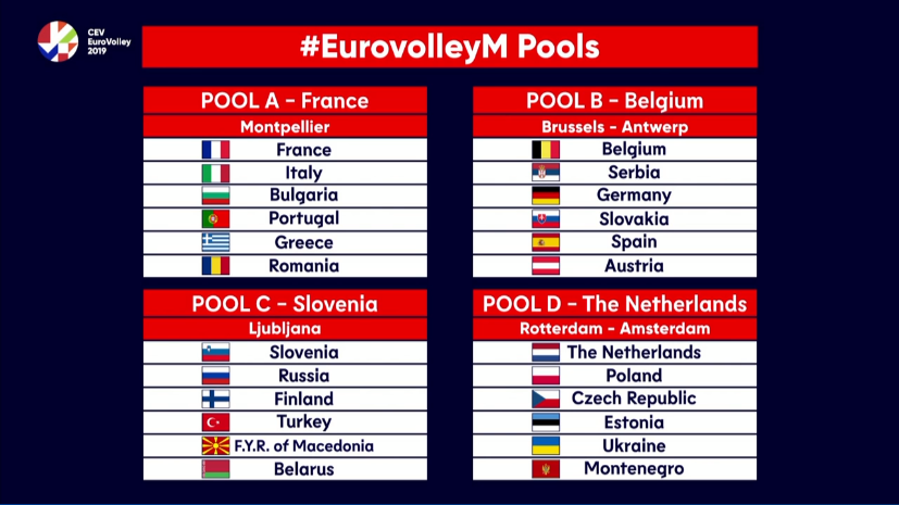 V skupini A, ki bo nastopala v Montpellierju, bodo poleg gostiteljev Francozov nastopale še reprezentance Italije, Bolgarije, Portugalske, Grčije in Romunije. Skupina B bo svoje tekme odigrala v Belgiji, in sicer v Bruslju in Antwerpu. Z domačini se bodo pomerile ekipe Srbije, Nemčije, Sloveške, Španije in Avstrije. V Rotterdamu in Amsterdamu na Nizozemskem pa bodo svoje tekme v skupini D odigrali Poljaki, Čehi, Estonci, Ukrajinci Črnogorci in domačini Nizozemci.