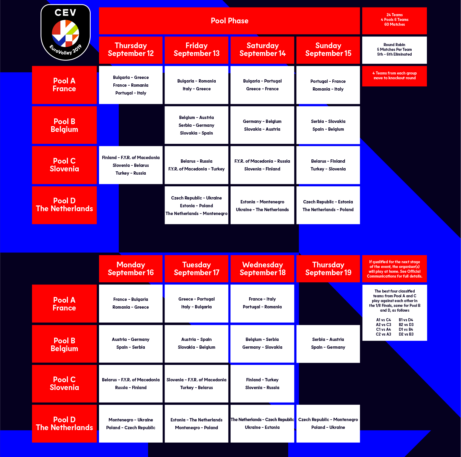 Evropska odbojkarska konfederacija CEV je objavila končni razpored tekem skupinskega dela evropskega prvenstva za moške, ki ga bodo septembra skupaj gostile Francija, Slovenija, Nizozemska in Belgija. Slovenski odbojkarji bodo otvoritveno tekmo igrali proti Belorusom.