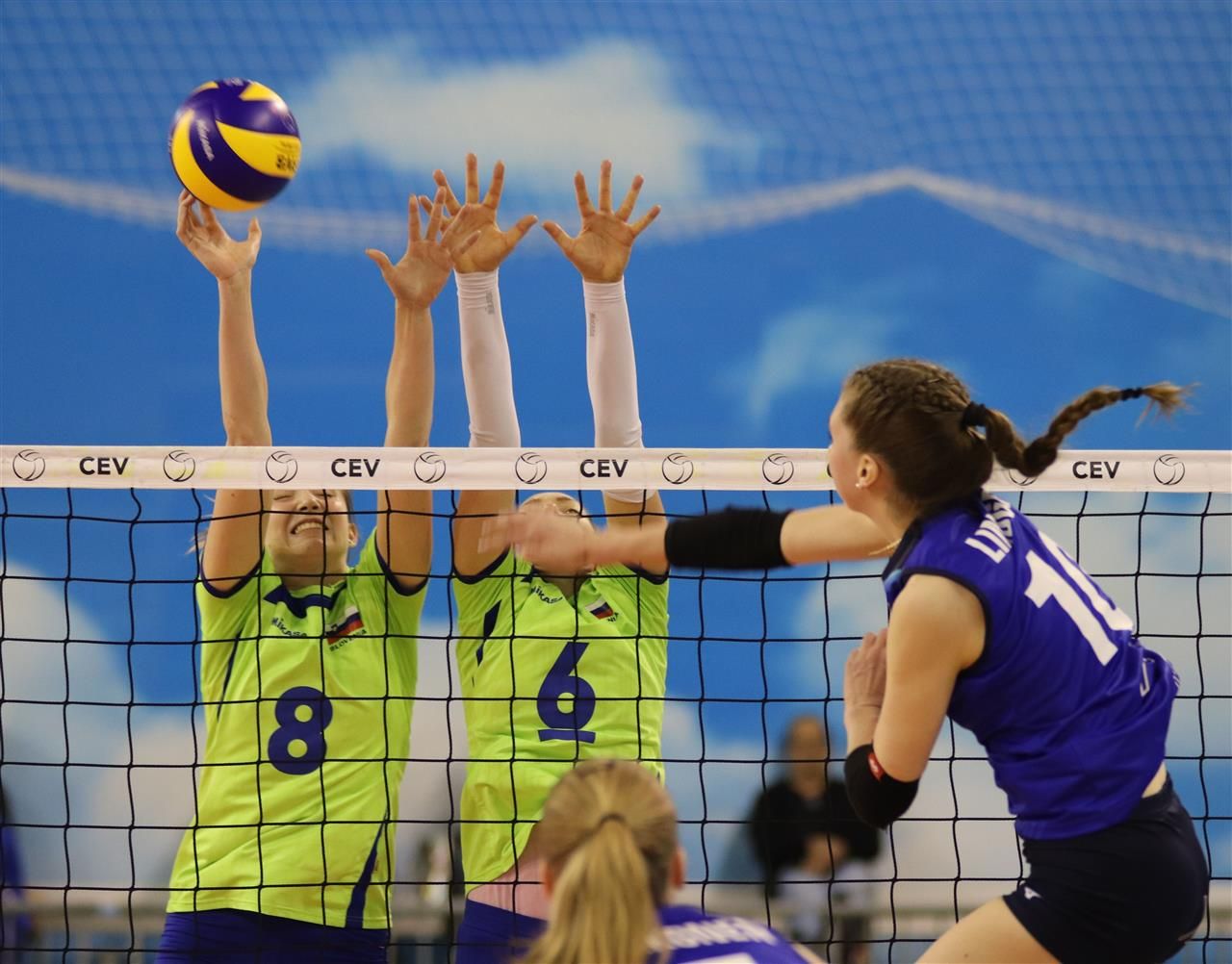 Slovenke, v postavi Eva Pogačar, Eva Zatkovič, Alja Jerala, Ajda Ščuka, Ana Mojca Krajnc, Brina Bračko in Anja Mazej, so odločilno srečanje kvalifikacij proti Finski začelo zelo dobro, saj so po uvodnem vodstvu tekmic z 1:0 nanizale kar šest zaporednih točk za vodstvo s 6:1. Finski selektor Luca Chiappini je nalet naše vrste skušal zaustaviti s polminutnima odmoroma, a so varovanke Borisa Klokočovnika še naprej narekovale ritem igre in povedle z 10:3 in 12:7. Nasprotnice so se jim, predvsem na račun dobrih začetnih udarcev, prvič približale na 12:9, nato pa še na 15:13, zato je bila slovenska klop primorana poseči po prekinitvi. Naša dekleta so sicer ostajala v ospredju, a so jim bile tekmice ves čas za petami (19:17), pri 21:19 pa je našim uspel nov niz točk, s katerim so si zagotovile zanesljivo zmago s 25:20.
