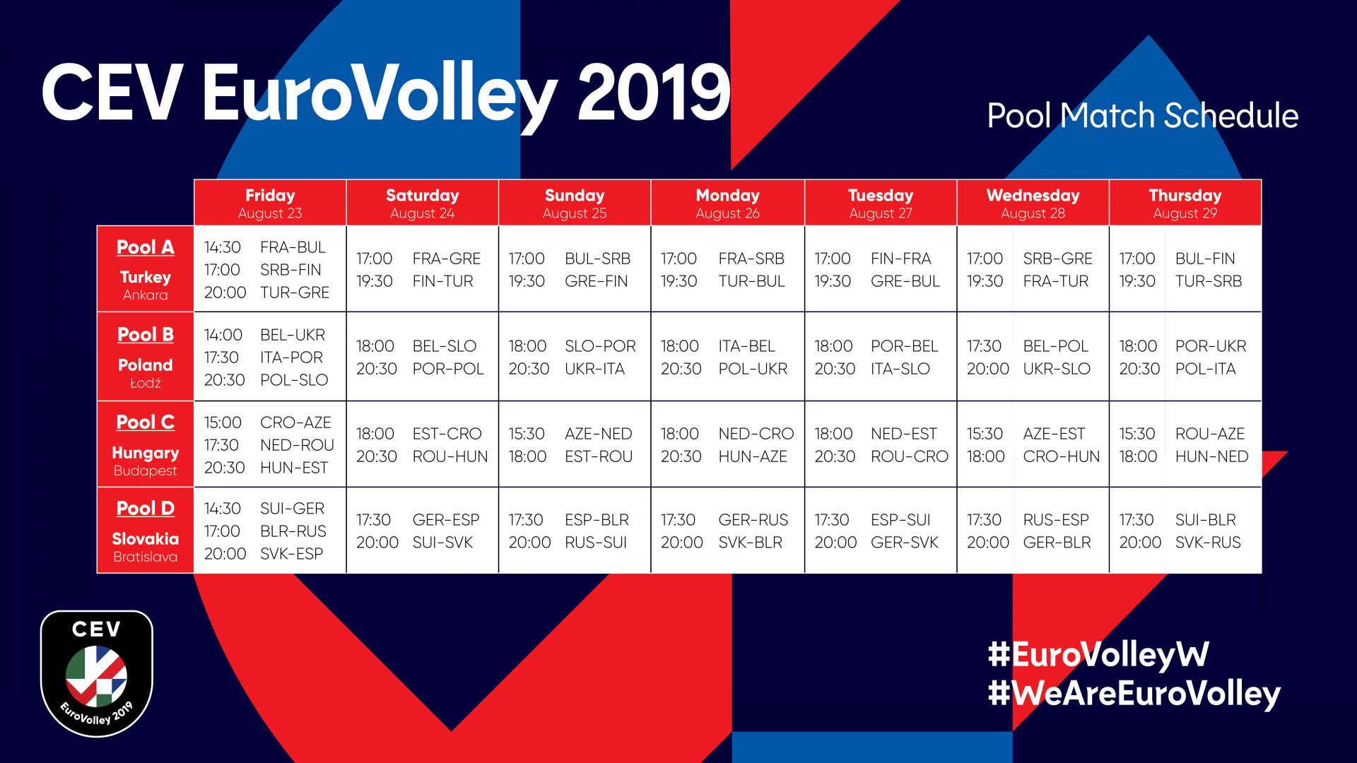 Prvi dan prvenstva bomo v vseh štirih skupinah, v Ankari, Lodžu, Budimpešti in Bratislavi, spremljali po tri tekme, prva, med Francijo in Bolgarijo, bo na sporedu v okviru skupine A, v Turčiji. Naša dekleta je doletela čast, da bodo uvodno tekmo na prvenstvu odigrala proti domači izbrani vrsti, pred več kot 12.000 gledalci.