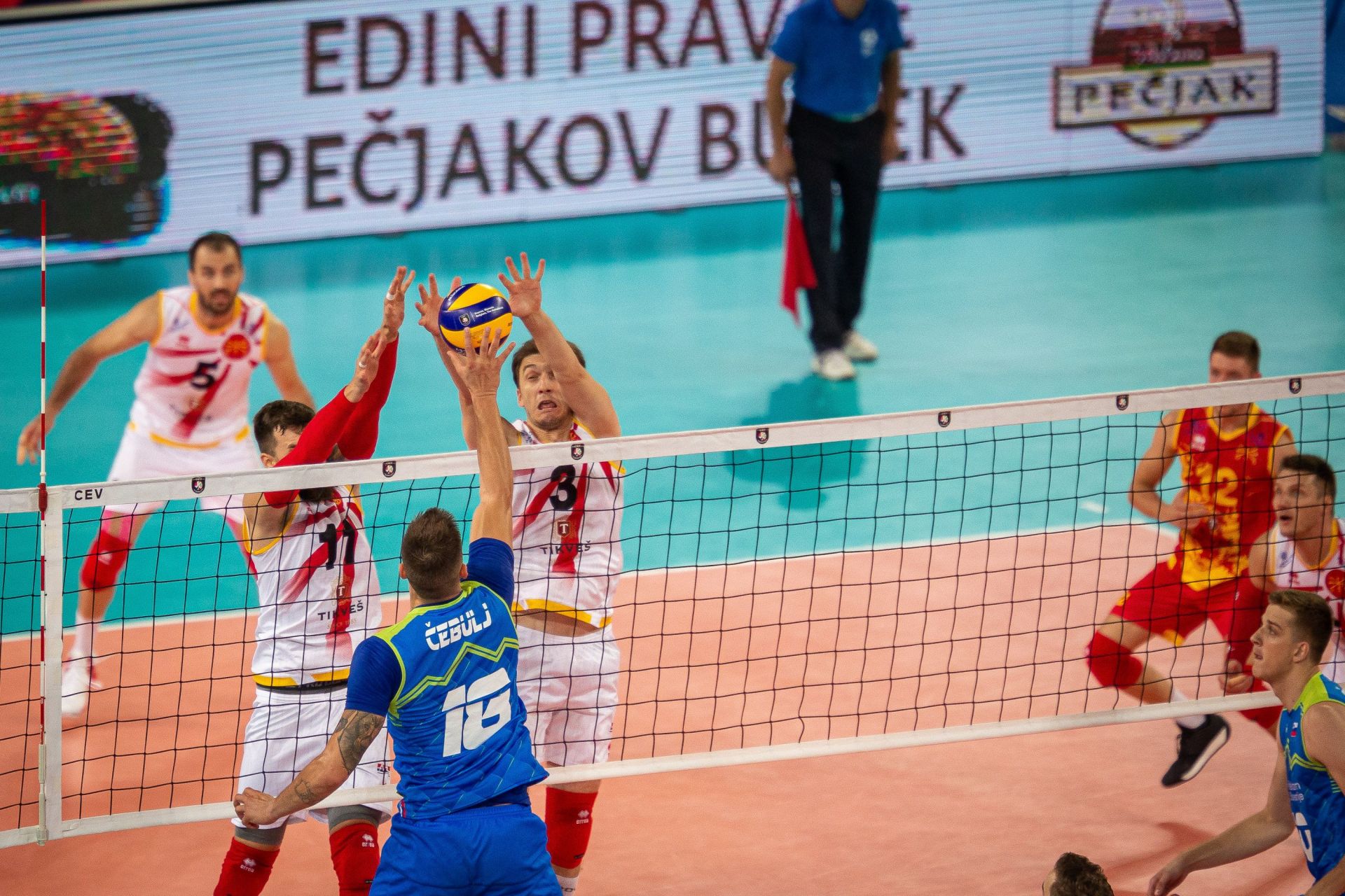 Slovenski odbojkarji so z borbeno igro v obrambi, ko sta se izkazala Kovačič in Urnaut ter z blokom Videčnika nekoliko oddaljili od razigranih tekmecev (9:6). A znova se varovanci Nikole Matijaševića niso predali in so se našim povsem približali. Štern, Urnaut in Pajenk so takoj zatem povišali razliko na 13:9, na 15. točki pa smo po dveh zaporednih blokih gostov videli novo izenačenje. Dve napaki gostov in točka Čebulja so naše pripeljale do 18:15, Videčnik je prinesel 20. točko. Slovenci so si po odličnem napadu Urnauta priigrali tri zaključne žoge pri 24:21. Makedonci so prek Mileva izničili dve, nato še tretjo tretjo pa po odmoru na zahtevo Giulianija. Vlado Milev je nato še blokiral za zmago Severne Makedonije s 26:24.