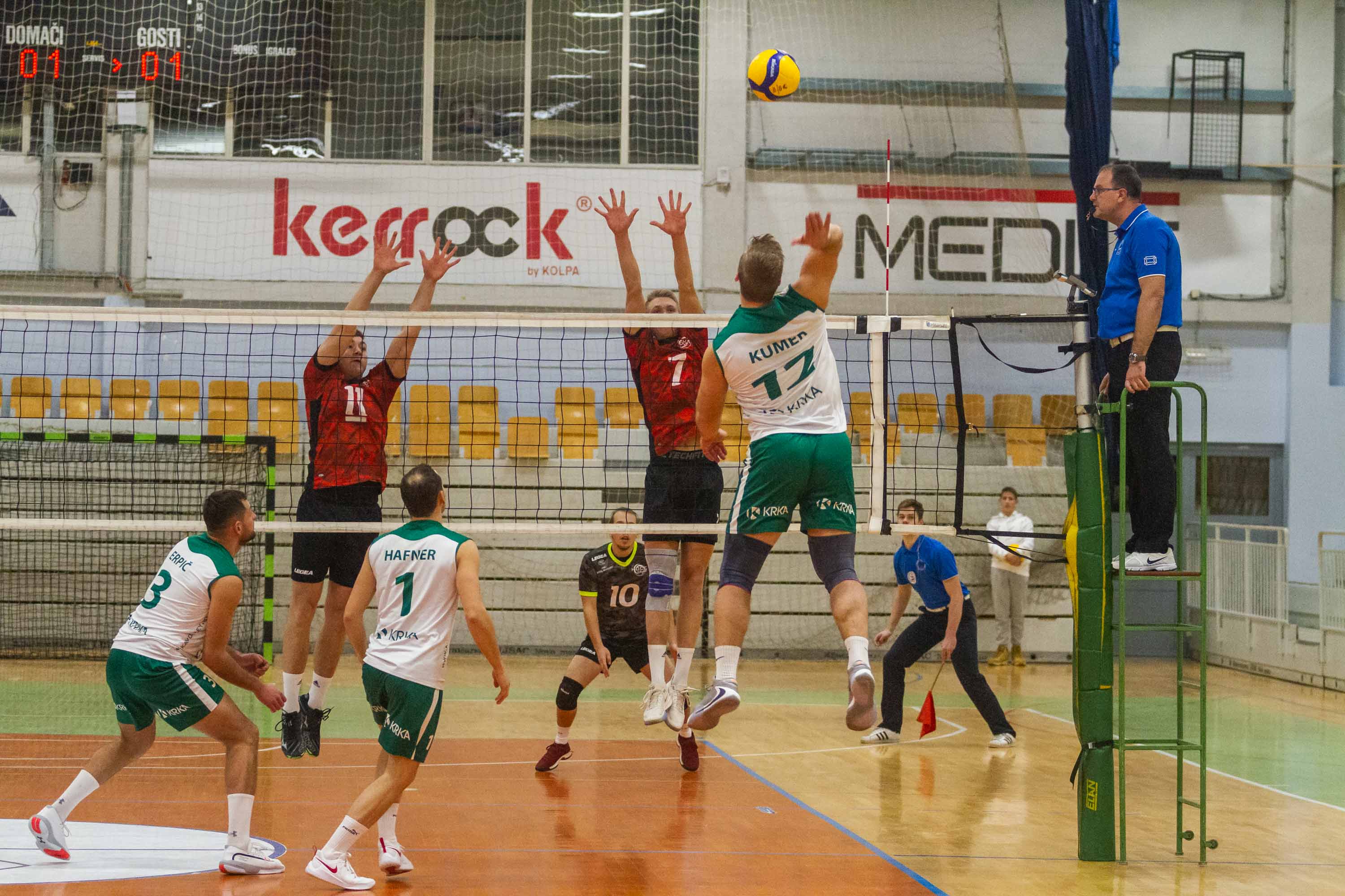 Hočani so v prvem nizu vse do desete točke držali korak s Krkaši, nato pa so domači pritisnili na plin. Z nekaj dobrimi servisi so gostom otežili razvoj igre in jih prisilili tudi v nekaj napak, z zanesljivo igro v napadu pa so pobegnili na 18:12. Štajerci so nato zapretili z delnim rezultatom 4:2, a domači trener Tomislav Mišin je s polminutnim odmorom prekinil nalet, njegovi varovanci pa so niz nato varno peljali do konca. Mišin je ob koncu niza priložnost ponudil tudi Renku, Travniku in Puclju. Crnjanski je z asom ubranil tretjo zaključno žogo domačih, njegov naslednji servis pa je na srečo domačih končal v mreži. Prvi niz je domačim pripadel predvsem po zaslugi izvrstne učinkovitosti v napadu, s šestimi točkami pa je izstopal David Kumer.