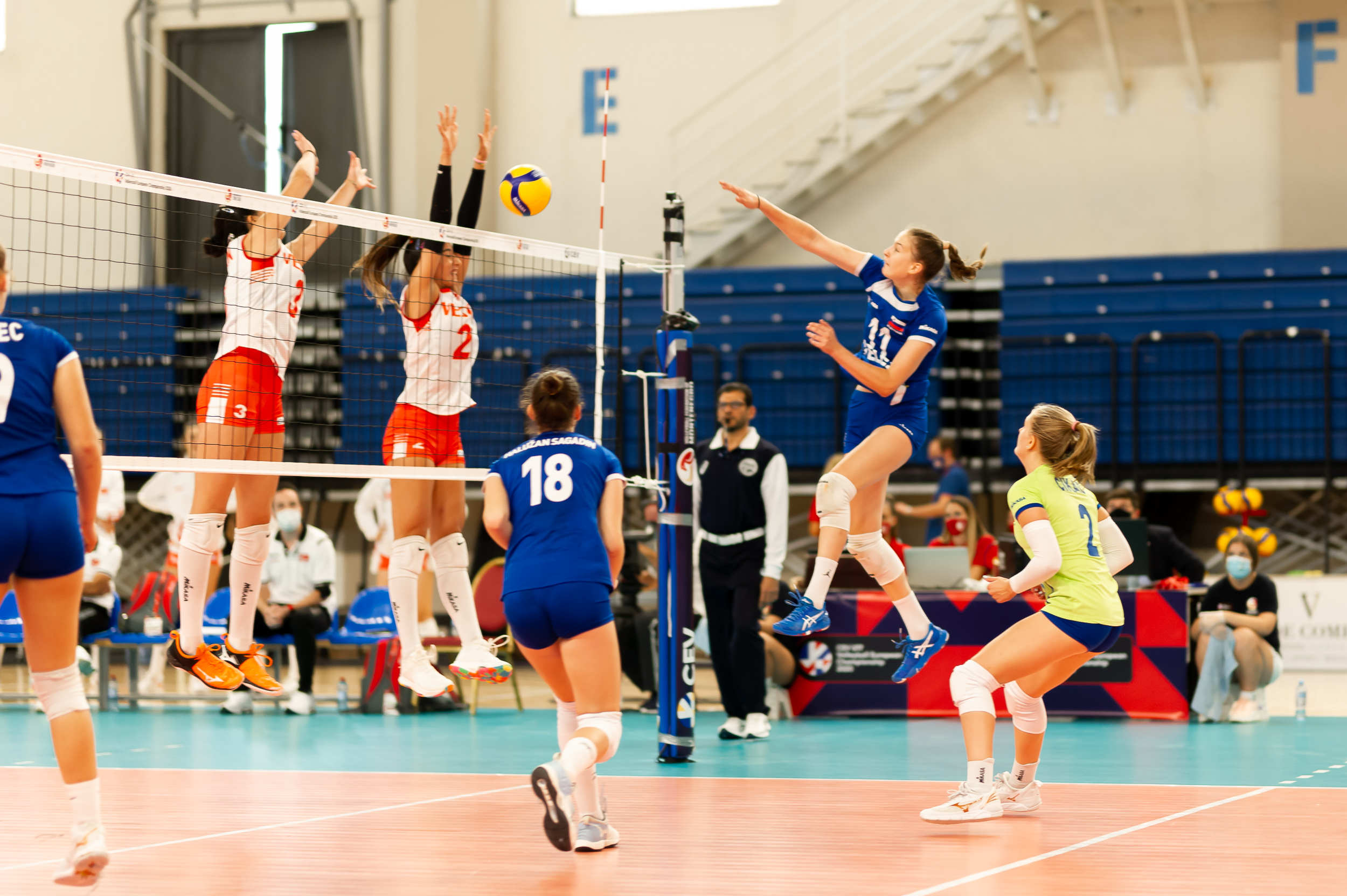 Slovenski selektor Samo Miklavc je drugi obračun na evropskem prvenstvu začel z zasedbo Žana Ivana Halužan Sagadin na mestu podajalke, s Tajo Gradišnik Klanjšček kot korektorico, s srednjima blokerkama Nejo Čižman in Žano Godec, sprejemalkama Seleno Leban in Najo Šalamun ter prosto igralko Urško Cikač.