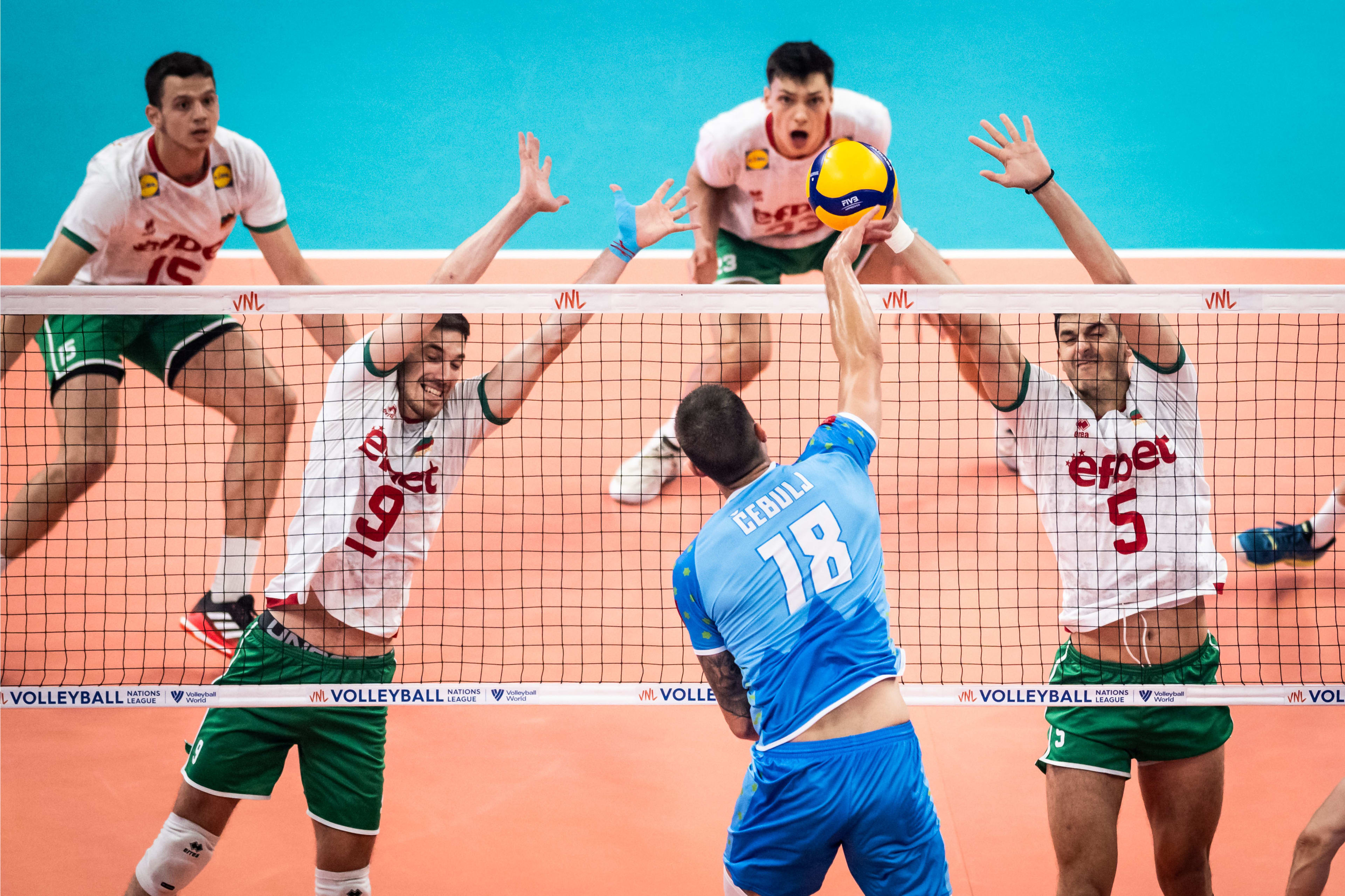Slovenski odbojkarji so srečanje z Bolgarijo začeli silovito, z blokoma Kozamernika in Čebulja, ki je dodal še napad za vodstvo s 4:0 ter tudi za 7:4. Bolgari so se najprej približali na 8:7, nato pa po servisih Atanasova s kar štirimi zaporednimi bloki pripravili preobrat in povedli z 12:10. Po tehničnem odmoru so se naši zbrali in prek Možiča poravnali na 13:13, a je moral po novem bloku Nikolova Lebedew pri zaostanku s 14:16 poseči po odmoru. Tekmeci so vodili tudi z 18:16 in 19:18 ter končnico začeli s točko naskoka. Čebulj je z napadom izenačil na 20:20, Štern pa je z blokom poskrbel za novo slovensko vodstvo pri 21:20. Borbeni Ropret je Možiču zagotovil protinapad za 22:20, mladi sprejemalec pa je tudi prebil blok nasprotnikov za 23:21. Čebulj je takoj zatem prispeval prvo zaključno žogo ter naši vrsti prinesel zmago s 25:22.