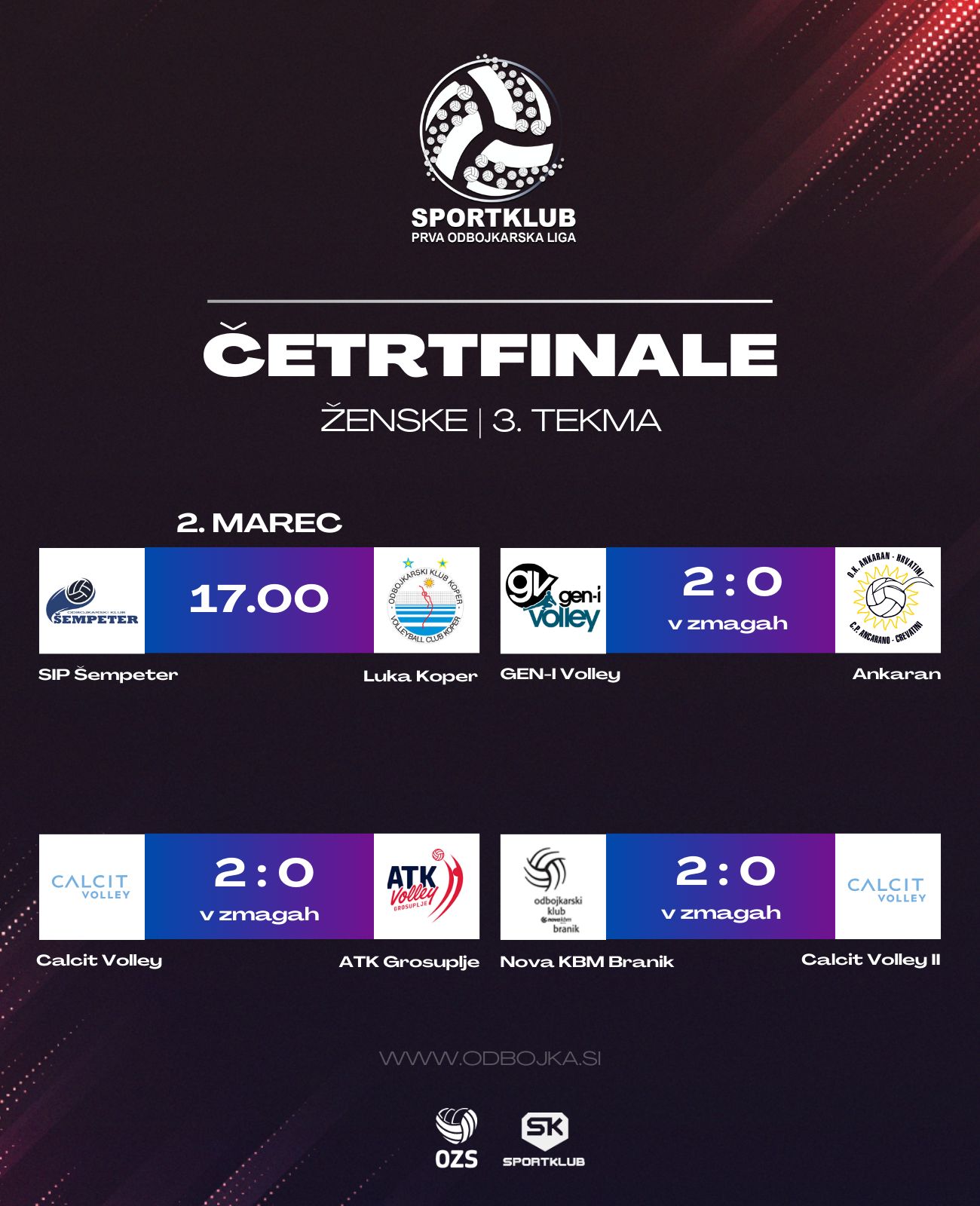 V ženski Sportklub odbojkarski ligi so si v sredo mesto v polfinalu že priigrale odbojkarice Calcit Volleyja, Nove KBM Branik in GEN-I Volleyja, čakamo le še na zadnje udeleženke polfinala. Druga tekma četrtfinala se je namreč končala z zmago Šempetrank, medtem ko so na prvi tekmi zmagale Koprčanke. Obe tekmi sta se končali po treh nizih z zmagoslavjem gostujoče ekipe. Tretja tekma četrtfinala med SIP Šempetrom in Luko Koper bo na sporedu v soboto ob 17. uri, gostiteljice pa bodo Šempetranke.