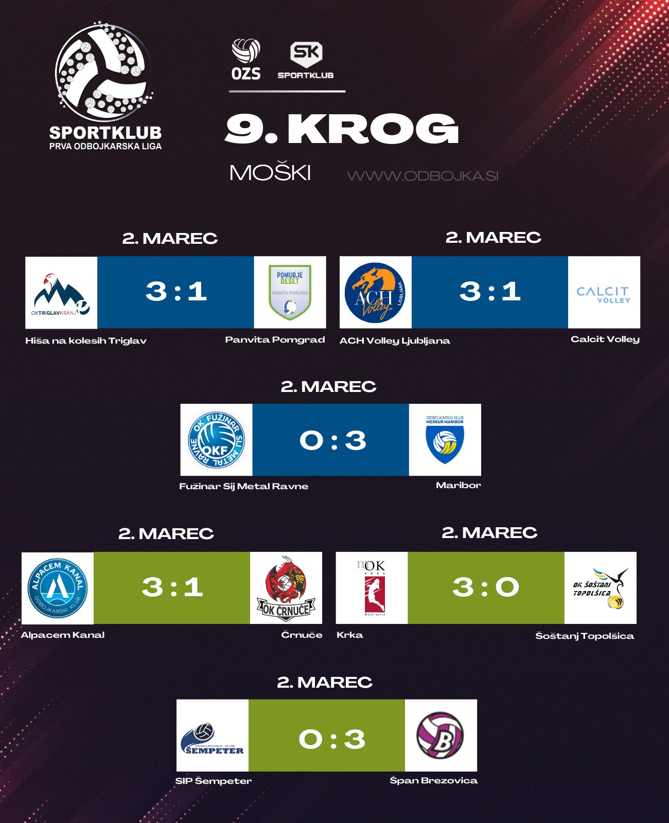 V zeleni skupini so odbojkarji Alpacema Kanal v 9. krogu Sportklub prve lige doma s 3:1 premagali Črnuče ter se tako utrdili na prvem mestu lestvice zelene skupine. Kanalci so dobili uvodna dva niza, v katerih so gostje osvojili 21 oziroma 15 točk, tretji niz pa je postregel z zelo izenačeno igro, ki s eje končala v korist Črnučanov po podaljšani igri (25:27). Tudi v četrtem nizu sta bili ekipi zelo enakovredni, na koncu pa so več pokazali domačini (25:22).