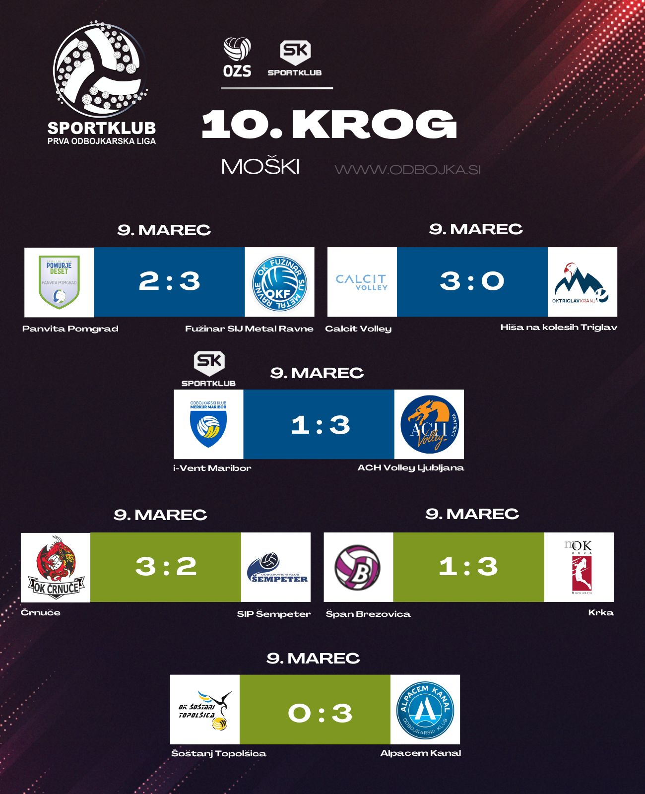 V 10. krogu modre skupine Sportklub prve lige sta se še drugič v enem tednu srečali ekipi i-Vent Maribor in ACH Volley Ljubljana. Sredi tedna so bili v pokalu boljši Mariborčani, ki so si tako priborili finale Pokala Slovenije, tokrat pa so tri točke na derbiju kroga osvojili Ljubljančani. Tekma se je končala z izidom 1:3 (20, -21, -28, -21). Ljubljančani so nastopili z nekoliko prevetreno ekipo, priložnost so dobili tudi tisti igralci, ki sicer niso del najmočnejše postave. V tekmo so bolje vstopili gostje iz Ljubljane, ki so povedli z 1:4, a so se domačini hitro vrnili in prevzeli vodstvo s 13:12. To so ohranjali tudi v nadaljevanju niza (19:16), Ljubljančanom pa nista pomagala niti premora na zahtevo trenerja Gačiča. Mariborčani so niz zaključili z delnim izidom 6:4 in niz dobili s 25:20. Ljubljančani so vodstvo prevzeli tudi na začetku drugega niza, vodili so za štiri (4:8). Gostje so bili v prednosti do izenačenja na 15. točki, a so po njem znova zaigrali bolje in niz osvojili z 21:25. V tretjem nizu je bila tekma precej bolj izenačena, ekipi sta se izmenjevali v prednosti, ob vstopu v končnico niza pa sta bili poravnani (20:20). Gostje so povedli z 21:23, na kar je z odmorom odreagirala domača zasedba. V izjemno napeti končnici in po podaljšanjem nizu so se na koncu veselili odbojkarji ACH Volleyja (28:30). V četrtem nizu so na začetku znova več pokazali Ljubljančani, ki so si priigrali lepo prednost (6:11). Mariborčani so z dvema odmoroma poizkušali priti do preobrata, a jim to ni uspelo. Zaostanek so sicer znižali na štiri, a niz je pripadel gostom (21:25). S to zmago so se odbojkarji ACH-ja utrdili na prvem mestu modre skupine.