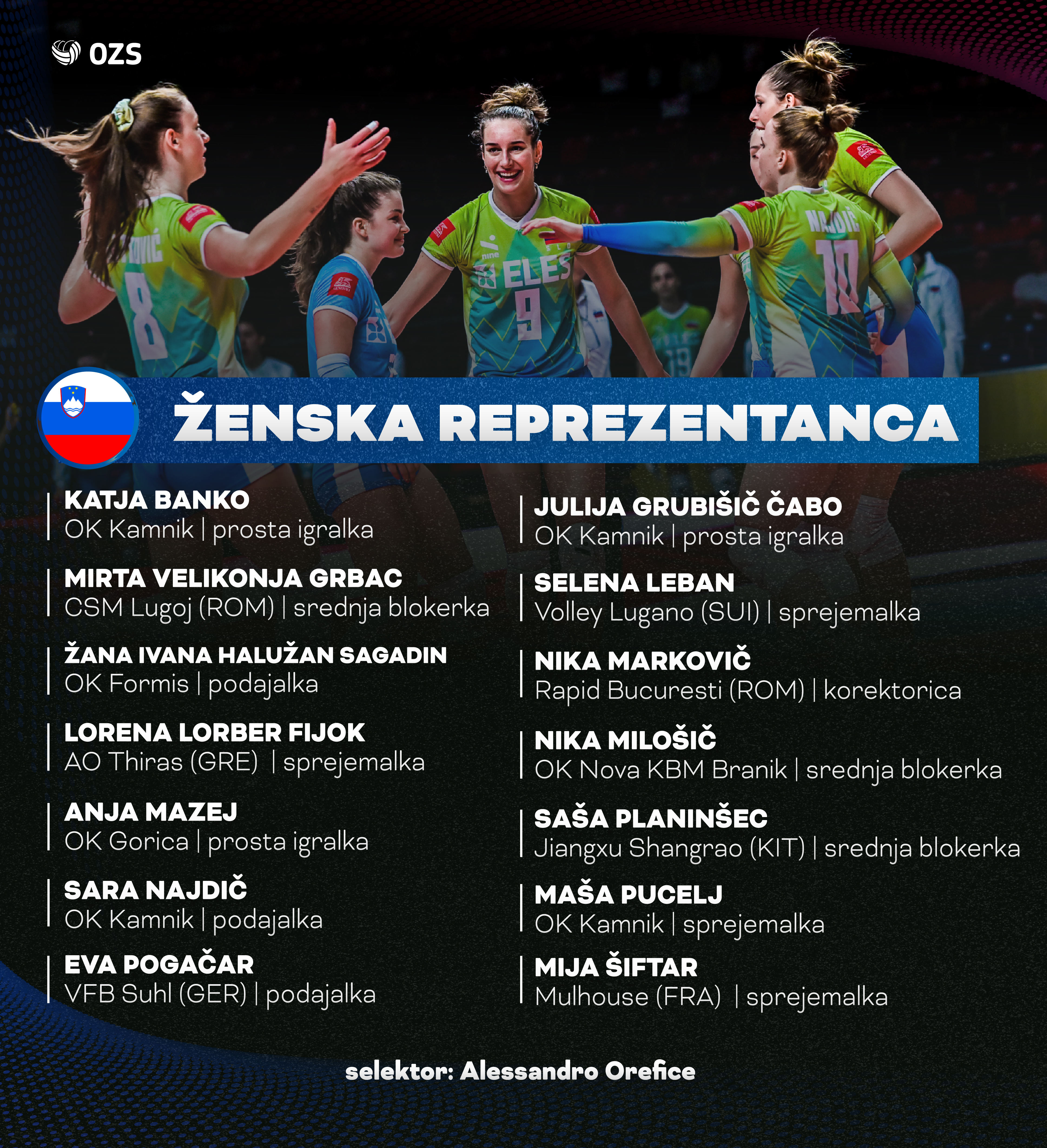 Novi slovenski selektor Alessandro Orefice bo odbojkarice zbral 30. aprila v Kranjski Gori, prvi trening pa bodo opravile 1. maja. Na njegovem seznamu je za zdaj 14 igralk. „Zveza mi je dala možnost, da za prvi ciklus na pripravah zberem 16 igralk. V tem trenutku sem še pustil odprte možnosti na mestih srednje blokerke in sprejemalke, a že zdaj imamo v sestavi reprezentance dobro kombinacijo nekaj izkušenih igralk in veliko mladih talentiranih odbojkaric. Odločil sem se tudi, da bom na priprave pripeljal tri podajalke in tri proste igralke, saj želim preveriti njihovo trenutno raven. Seznam se počasi zaključuje, v naslednjih dneh pa ga bom še nekoliko dopolnil.“