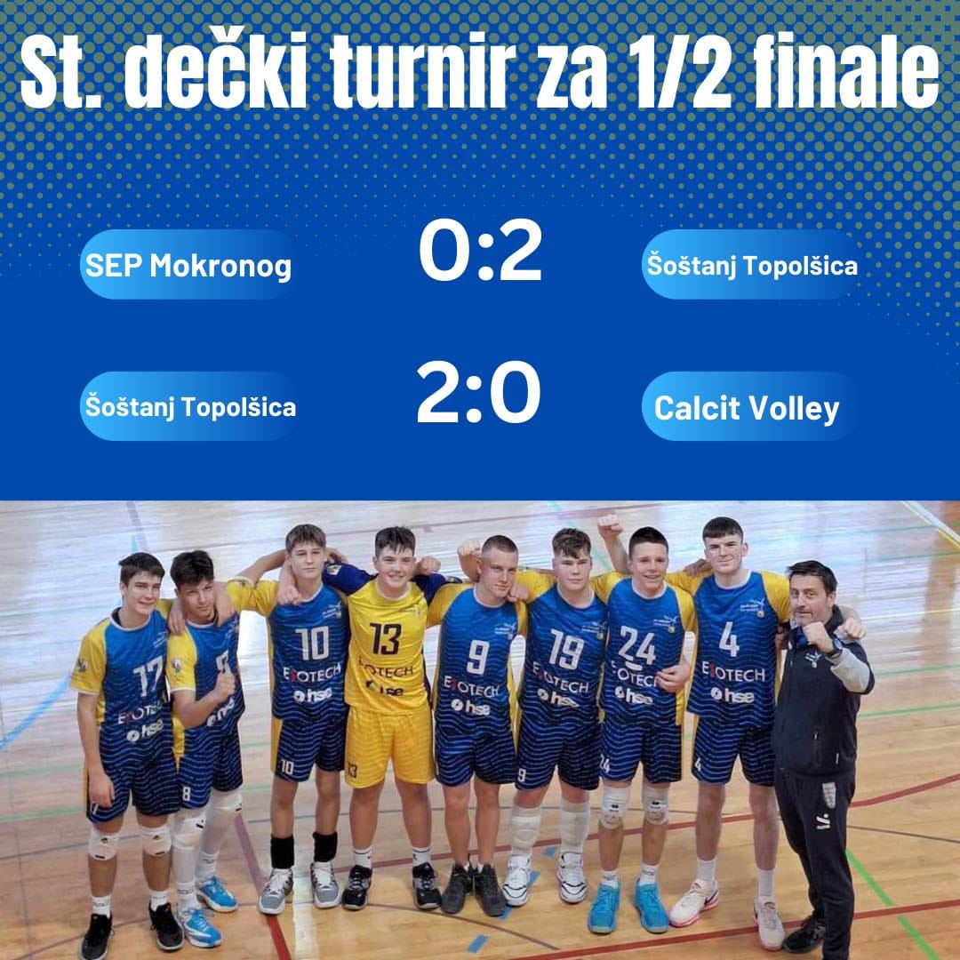 Državno prvenstvo za starejše dečke se preveša v zaključni del. Prejšnjo soboto so se ekipe namreč pomerile na četrtfinalnem turnirju za uvrstitev v polfinale prvenstva. Na koncu sta se uspeha veselili ekipi Šoštanja Topolšice in Calcit Volleyja. Šoštanjčani so na prvi tekmi z 2:0 premagali SEP Mokronog. Prvi niz je bil zelo izenačen, saj se je končal po podaljšani igri s 26:24, v drugem nizu pa so odbojkarji SEP Mokronoga osvojili 18 točk. Na drugi tekmi turnirja je Šoštanj Topolšica premagala še Calcit Volley z 2:0 (14, 17), tako da si je z dvema tekmama zagotovila napredovanje na polfinalni turnir. Tja so se uvrstili tudi Kamničani, ki so na prvi tekmi z 2:0 premagali ŠD Braslovče. Prvi niz se je končal z rezultatom 25:23, drugi pa s 25:19. Calcit Volley in ŠD Braslovče sta se pomerili še na odločilni tekmi za uvrstitev na polfinalni turnir. Tudi v drugo so bili uspešnejši Kamničani, a je bila tekma zelo izenačena. Prvi niz se je namreč končal po podaljšani igri z 29:27, drugi pa z rezultatom 25:23.