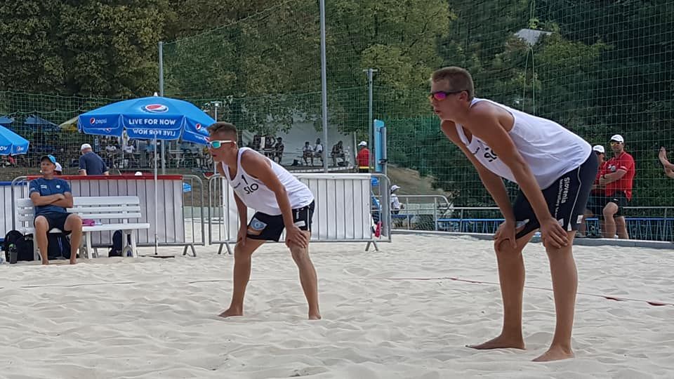 Slovenska prvaka v kategoriji do 18 let sta prvenstvo Stare celine na Češkem začela zelo dobro in v predtekmovalni skupini E dobila vse tri obračune. Z 2:0 sta bila boljša od Madžarov Strelija in Sandorja ter Angležev Goalena in Drysdala, nekaj več preglavic pa sta jima povzročila Čeha Benes in Maixner, ki sta našima odbojkarjema na mivki odščipnila niz.
